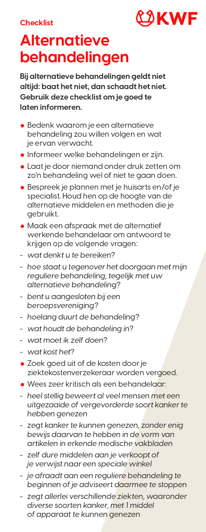 Op de website van KWF staat een checklist alternatieve behandelingen die nuttig is om na te lezen. Wij hebben mede op basis van deze checklist het volgende Stappenplan uitgewerkt:
