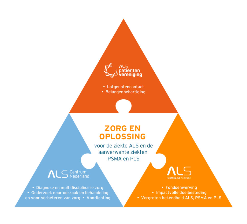 In Nederland is er een samenwerking voor ALS, PSMA en PLS, die de driehoek wordt genoemd. De driehoek bestaat uit de ALS patiëntenvereniging, het ALS Centrum (UMC Utrecht) en de Stichting ALS Nederland. Deze samenwerking is uniek in de wereld. Deze 3 partijen versterken elkaar, ieder vanuit zijn eigen perspectief en verantwoordelijkheid.